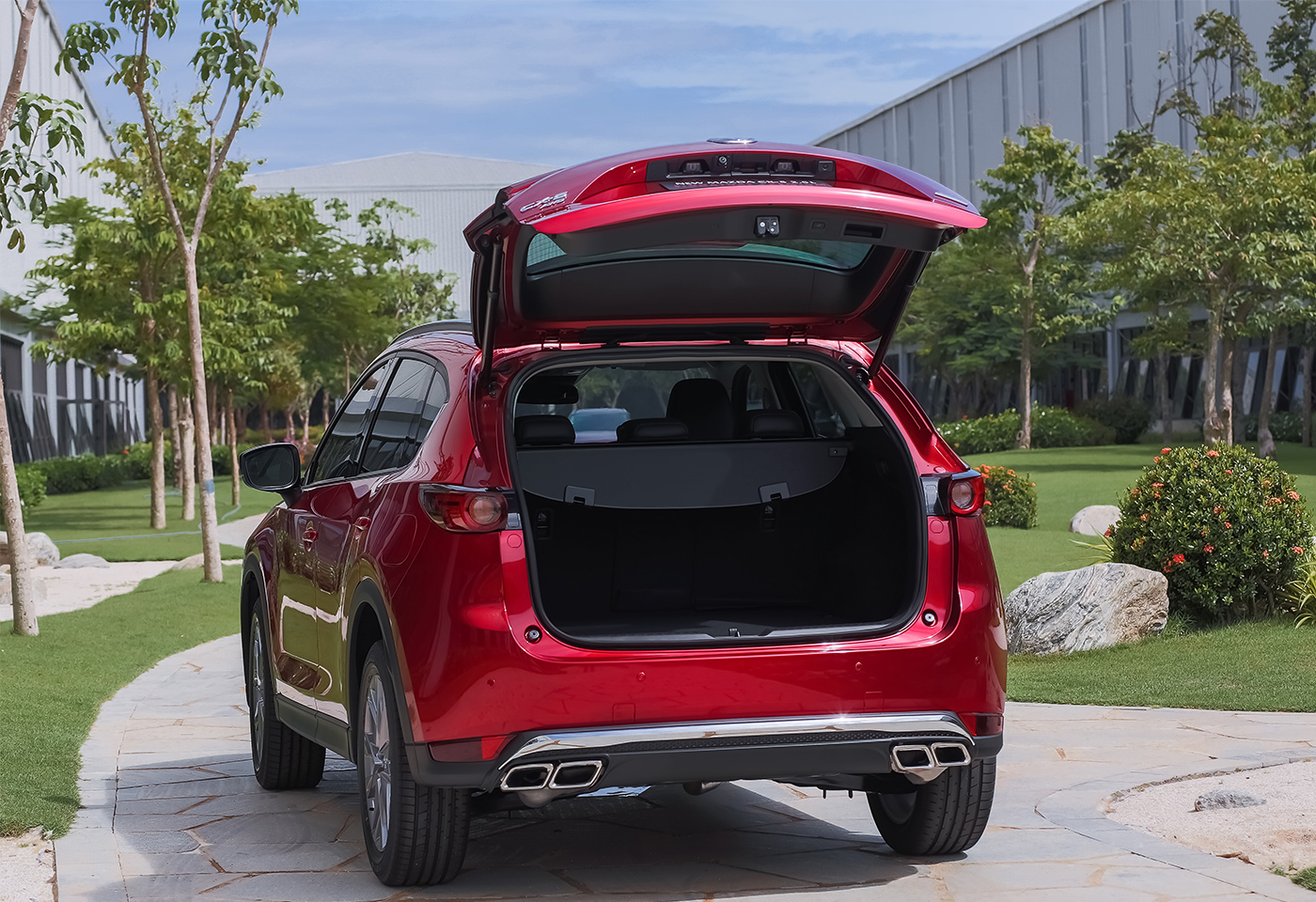 Phần đuôi xe tạo ấn tượng với ống xả kép thể thao cho vẻ ngoài đẹp mắt và cuốn hút, đồng thời bảo vệ phần đuôi xe tránh các vết trầy xước khi có va chạm. Những yếu tố này góp phần khiến ngoại thất của Mazda CX-5 mới trở nên mạnh mẽ, khỏe khoắn và đẳng cấp hơn so với phiên bản cũ.